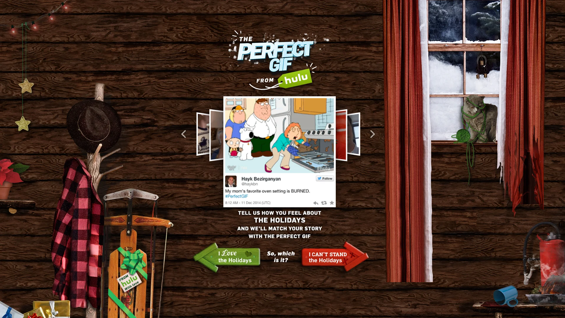 To power the experience, we created a database populated with thousands of GIFs from a wide swath of shows and applied hundreds of tags to capture the sentiment and context of each scene. As users typed their tweet into a box to tell us what they loved or hated about the holidays, an advanced natural language processing engine analyzed the contents of the user’s post to search for the best matching GIFs.